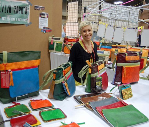 Now, I’m walking the aisle and these purses catch my eye. They are vibrant and colorful and totally awesome. And as I’m looking at them, I realize I’ve seen them somewhere before. Then as I look harder, I realize I actually own one. I ask the woman behind the booth if she ever sold in New York, and she said yes. And I asked her if she ever sold out of someone’s apartment, and she said yes. They had a sale at her friend’s apartment once in 1999.